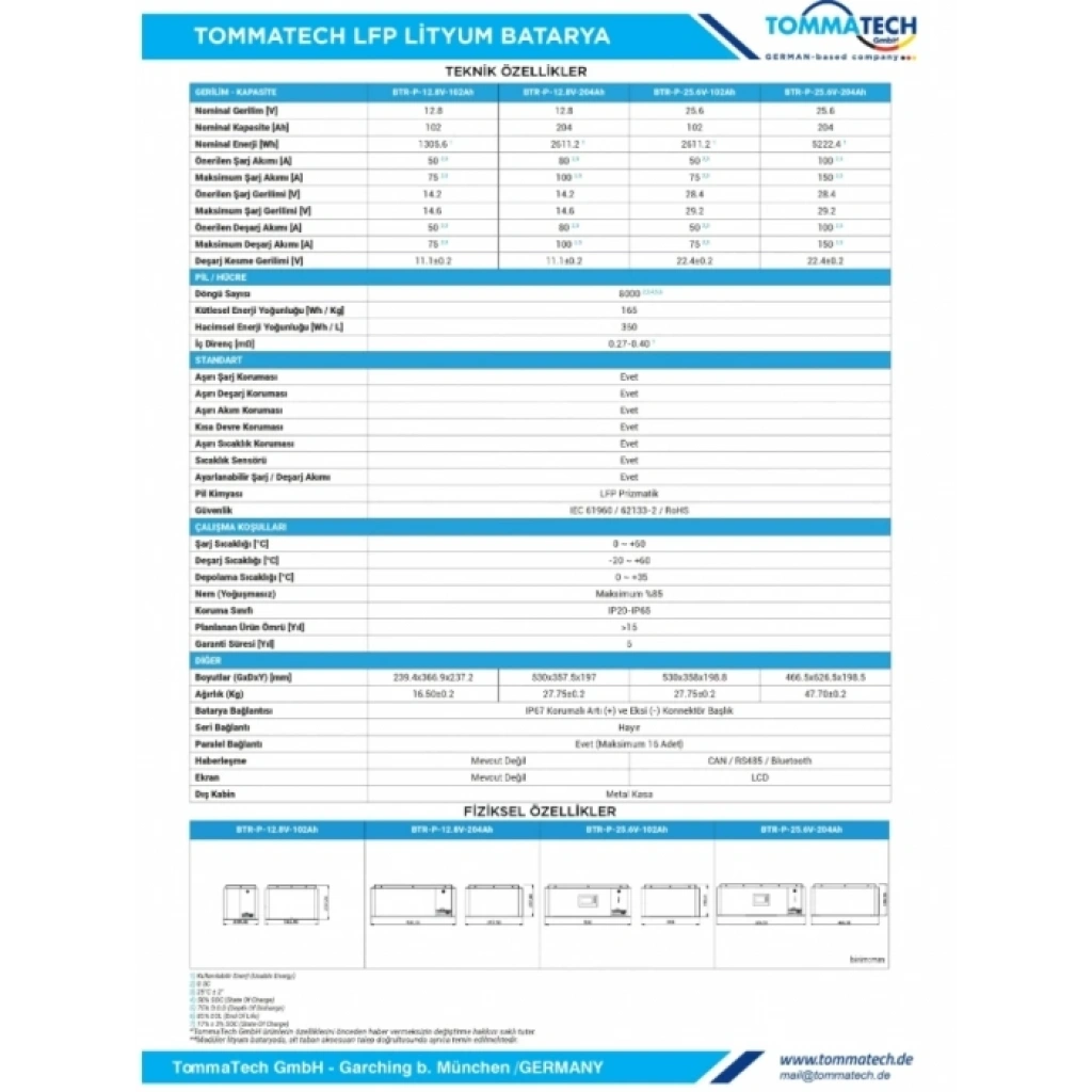 TommaTech 25.6V 204Ah LiFePO4 Batarya, modern güneş enerji sistemleri, karavan çözümleri, off-grid evler ve endüstriyel uygulamalar için tasarlanmış yüksek performanslı bir enerji depolama teknolojisidir. LFP kimyası sayesinde 6000+ döngü kullanım ömrü, yüksek güvenlik ve düşük enerji kaybı sunar.