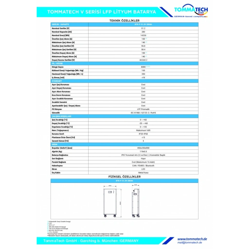 TommaTech Modüler V Serisi 51.2V 280Ah LFP Lityum Batarya