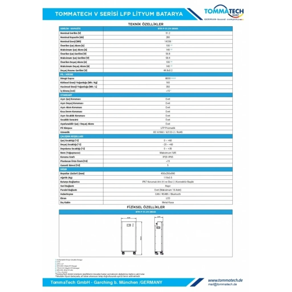 TommaTech Modüler V Serisi 51.2V 280Ah LFP Lityum Batarya
