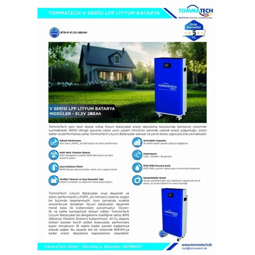 TommaTech Modüler V Serisi batarya, 16 adede kadar paralel bağlantı desteği sunar. Bu sayede küçük konut projelerinden büyük ticari ve endüstriyel uygulamalara kadar kolayca ölçeklenebilir bir enerji depolama altyapısı oluşturulabilir.