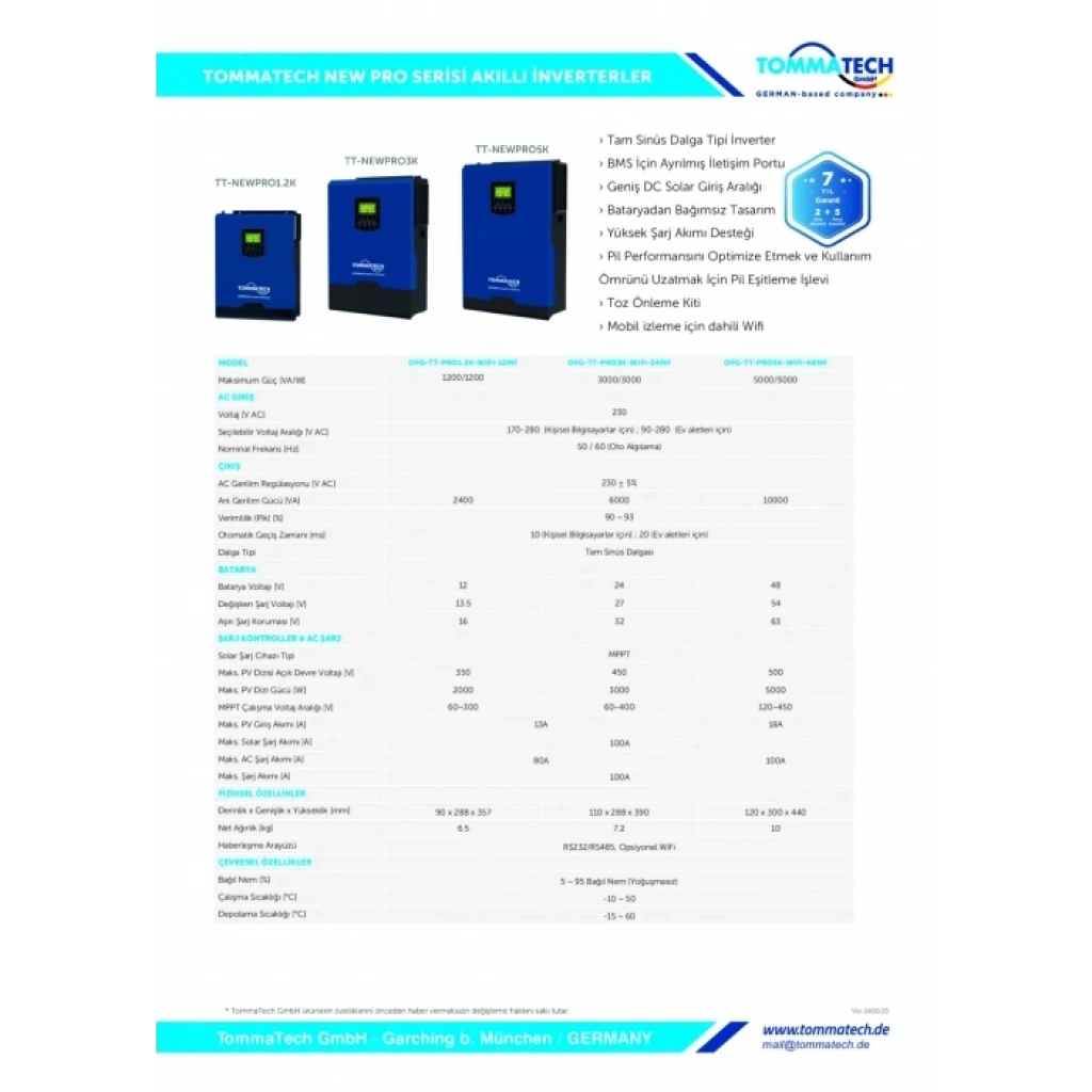 TommaTech 5kW New Pro Serisi, modern güneş enerji sistemleri için tasarlanmış akıllı bir off-grid / hibrit inverter çözümüdür. Gelişmiş MPPT teknolojisi, yüksek şarj kapasitesi, güçlü çıkış performansı ve tam koruma mekanizmaları ile evsel ve ticari küçük ölçekli sistemlerde maksimum verim sağlar.
