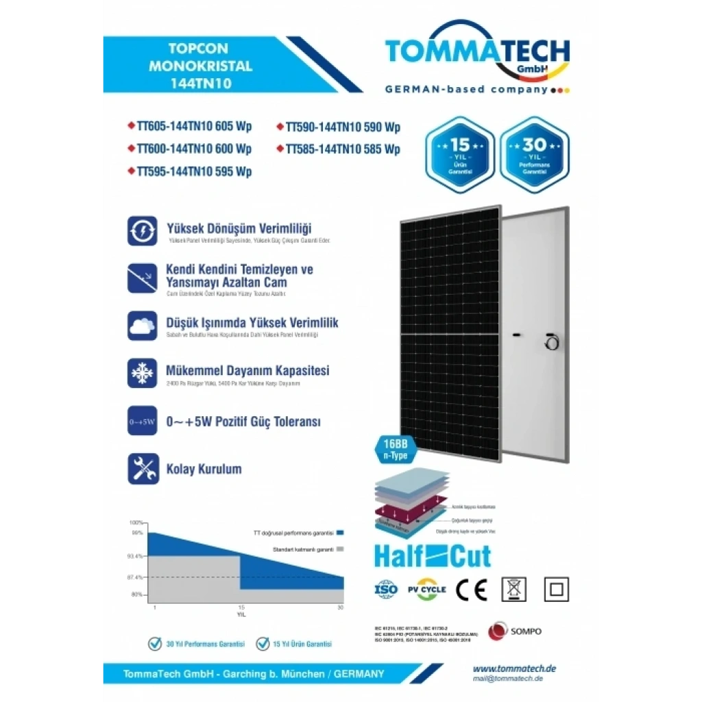 TommaTech, üretimde kullandığı premium monokristal hücreler ve sağlam laminasyon teknolojisi ile uzun ömürlü solar çözümler sunar. Panel, zorlu hava şartlarına karşı yüksek dayanıklılıkla üretilmiştir.