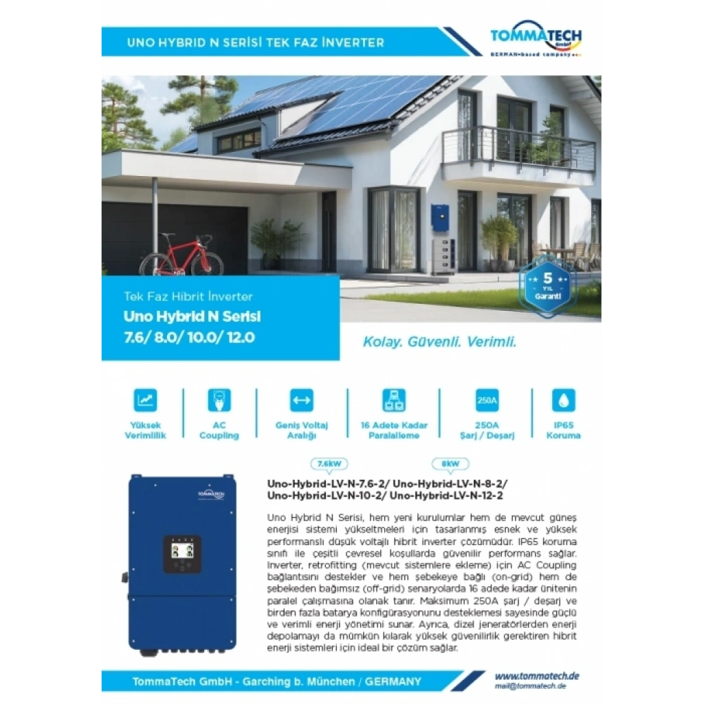 TommaTech Uno Hybrid N 12.0 kW Tek Faz Hibrit İnverter, yüksek güç gerektiren konut ve ticari uygulamalar için geliştirilmiş, batarya destekli yeni nesil bir hibrit inverterdir. Güneş enerjisi, şebeke ve batarya kaynaklarını aynı anda yöneterek maksimum verim ve kesintisiz enerji sağlar. Tek faz sistemlerde yüksek performans, güvenlik ve esneklik arayan kullanıcılar için ideal bir çözümdür.