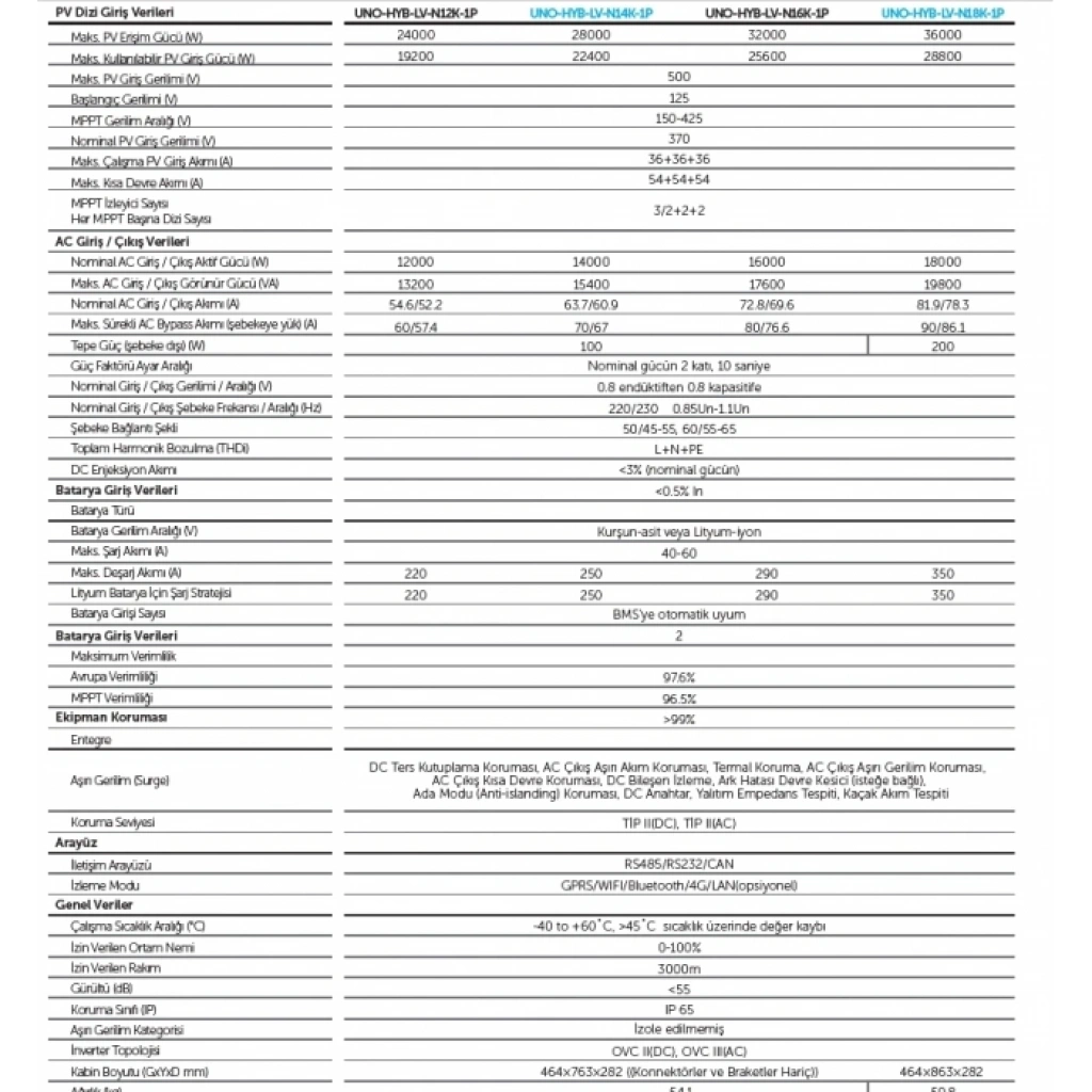 RS485, RS232 ve CAN haberleşme arayüzlerine sahip olan cihaz; Wi-Fi, Bluetooth, LAN ve 4G gibi opsiyonel izleme çözümleri ile uzaktan izlenebilir. IP65 koruma sınıfı, sessiz çalışma yapısı ve geniş çalışma sıcaklık aralığı sayesinde iç ve dış mekân kurulumları için uygundur.